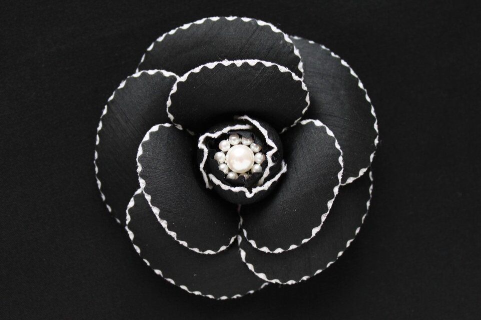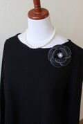 カメリア(つばき)の端正な輪かくを際立たせたコサージュです。ソフトな黒のシルクシャンタンを使用しています。中心にパールをあしらって華やかに仕上げました。
