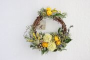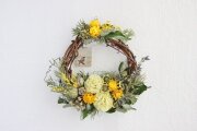 花材:ドライフラワー(カイガラソウ・スカビオサ・バーゼリア・ミモザ・キンポウジュ・バラの葉