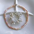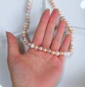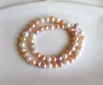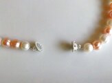 サーモンピンクと、ラベンダー色、ホワイト の3色のパールを使った優しい色合いのネックレス。
