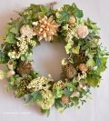 リース土台:ナチュラル素材 直径約20センチ リース素材:アーティフィシャルフラワー(アリウム・ベリー2種類・ユーカリ・アイビー・スマイラックス、など)、自然素材(チスパ・イガナス・ソーラーローズ・ナッツ・マルガリータグラン・山苔、など)