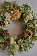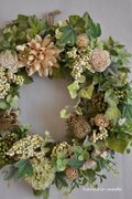 ベージュやグレージュのニュアンスカラーが美しい、ボリューム感のあるスワッグです。白バラ、ドライフラワー風の紅バラをアクセントにどこか時間を超えた幻想的な雰囲気も感じられてとても心惹かれます。 また、スワッグの向きや花器に応じた飾り方を提案して下さっているので、これから色々な表情を見つけて行ければと思います。今回も素敵な作品をありがとうございました。