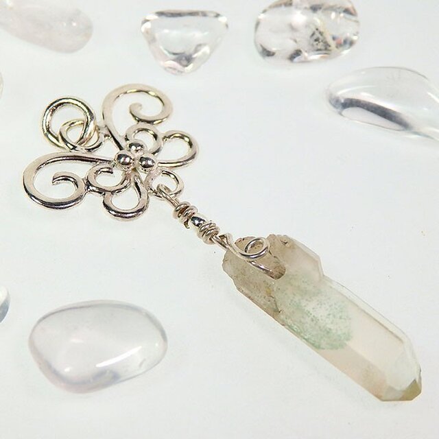 淡いグリーンのファントムクォーツをオリジナルの唐草羽飾りに組み合わせた個性的なペンダントに仕上げました。