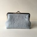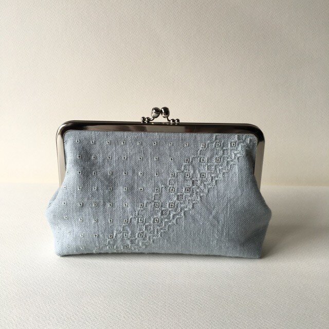 サックスブルー(グレーが入っている感じ)の色のリネン生地に生地とほぼ同じ色の刺繍糸で