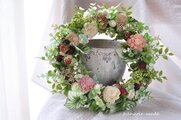 ベージュやグレージュのニュアンスカラーが美しい、ボリューム感のあるスワッグです。白バラ、ドライフラワー風の紅バラをアクセントにどこか時間を超えた幻想的な雰囲気も感じられてとても心惹かれます。 また、スワッグの向きや花器に応じた飾り方を提案して下さっているので、これから色々な表情を見つけて行ければと思います。今回も素敵な作品をありがとうございました。
