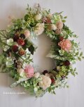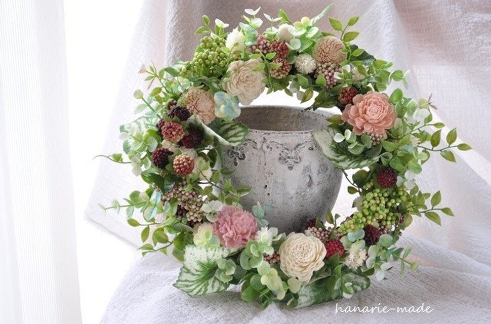 リース土台:ナチュラル素材 直径約20センチ リース素材:アーティフィシャルフラワー(フランボワーズ・グリーンの実・ユーカリ・カラードベゴニアなど)、自然素材(ソーラローズ・ソーラーカーネーション・スタフラワーブロッサム・マルガリータグラン・ライスフラワー(プリザーブド)・山苔、など)