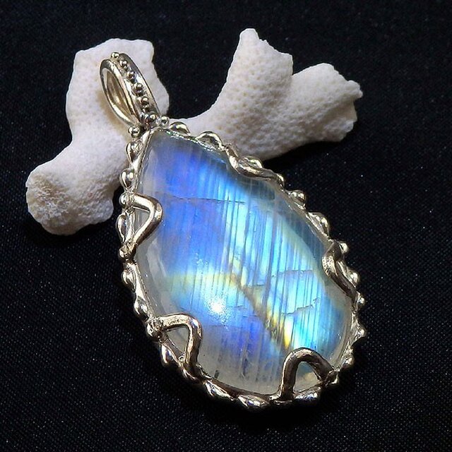 光の当たる角度によって、鮮やかなブルーやイエロー、グリーンの輝きが浮かび上がる大粒のレインボームーンストーンを粒飾りのペンダントに仕上げました。