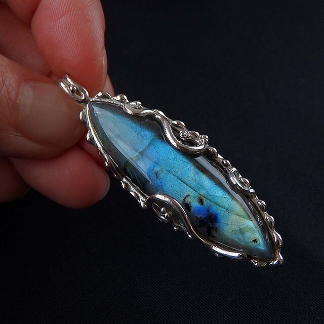 光の当たる角度によって、ライトブルーの輝きが浮かび上がる美しいラブラドライトを唐草フレームのペンダントに仕上げました。