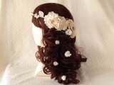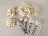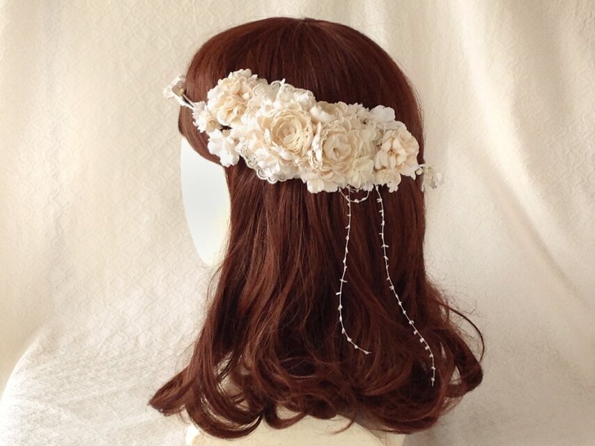 大きめの髪飾り1点と小さめのヘアクリップ2点、丸めると花冠になるガーランド1本、小花のUピン5本の計9点セットです。