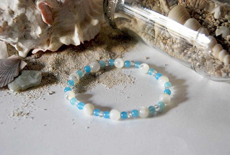 素材:青メノウ、ホワイトシェル、水晶、オペロンゴム