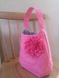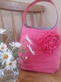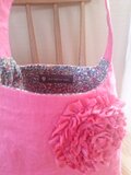 チェック&ストライプのやさしいリネン(スイートピー)で作りました。同じ生地でつくったカーネーションのお花がアクセントのオリジナルデザインです。