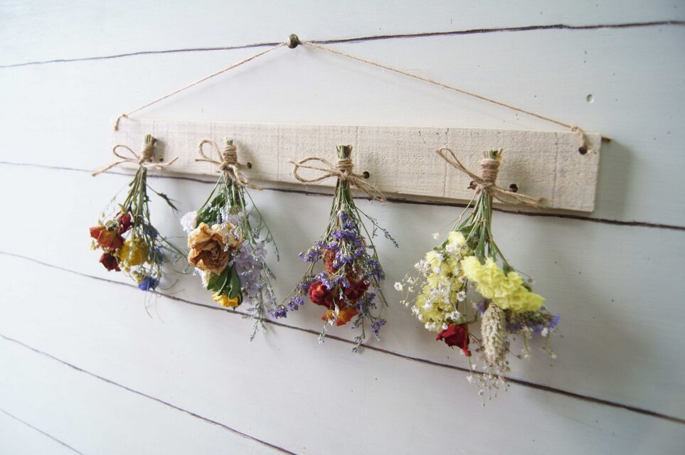 自家製ドライフラワーを古材風に加工した板にセットしました。