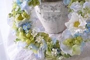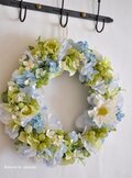 フレッシュで 優しい雰囲気のリース、アーティフィシャルフラワーのみで制作しております。リース左上のブルーのリボンは取り外しできます。