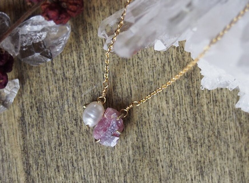 原石のピンクトルマリンとパールのネックレス