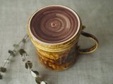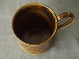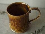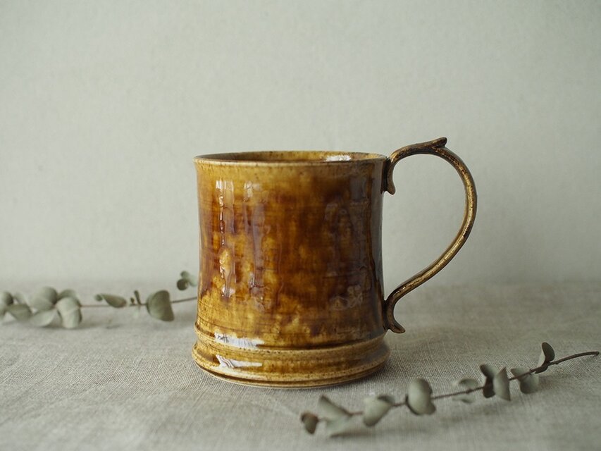 べっこうの様なアメ色の釉薬をかけた陶器のマグカップです。