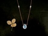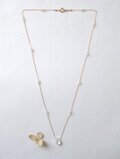 神秘的で何にでも合う天然石レインボームーンストーンのネックレス。メイン石のレインボームーンストーンは形も虹色の輝きもとても美しいものを選びました。チェーンの間にも同じムーンストーンのボタン石を2石ずつつないで、繊細で、かつ美しい華やかさがある、シンプルなネックレスです。金の細いチェーン、虹色に輝く白く透明な石はどんな装いにもあいますし、普段にもフォーマルにもお使い頂けると思います。