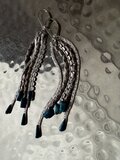 ブラックマーブルのターコイズカボションは、1970年代のウェストジャーマンヴィンテージ。渋い輝きのフリンジが耳元でサラサラと揺れます。フリンジは、デザインの異なるチェーンを重ねて、より印象的な仕上がりに。