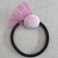 オリジナルデザインの綿布をくるみボタンにし、チュールを組み合わせてヘアゴムにアレンジしました。