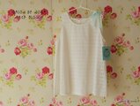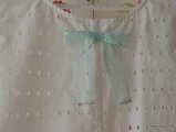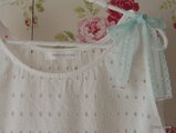 体に張り付かないフレアの入った形でボトムにインするときれいなブラウジングが出ますし、暑い季節には裾を出して着て頂けると良く風を通し快適に過ごしていただけると思います。肩に水色のりぼん付ですが4枚目の写真のように好きな位置へ移動してお楽しみいただけます。リボン端はピンクのネオン糸ステッチ入り。