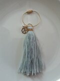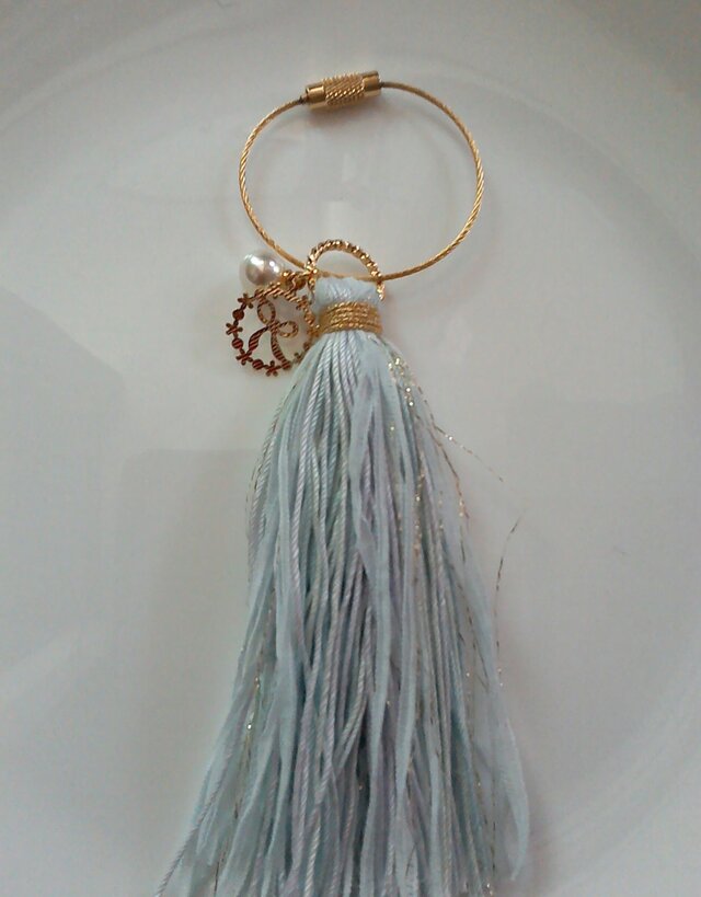 ラメ糸を混ぜ込んだチャーム付きタッセルキーリングです。