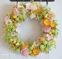 大きな粒のマスカット、そして小さな可愛い粒のマスカットカラーのグレープをたくさんリースに。あいだには、濃いオレンジ色とあわいオレンジ色、そしてクリーム色のヘリクリサム、ピンク色の紫陽花、ライトグリーンのスノーボールを選んでおります。自然素材では、クリーム色のチスパ、シダローズやソーラーローズ、ピンクのフリルフラワーに、黄色のマルガリータをそえて、ナチュラルな優しい雰囲気に。30cmよりやや大きめで、存在感があります。リース左上の英字のはいったリボンは、簡単に取り外しできます。