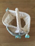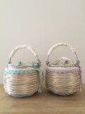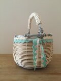 シルバーのアルミワイヤーと籐で編んだかごに、ミントグリーン色のレースを組み合わせた丸い形のかごです。バッグとしても使用できます。