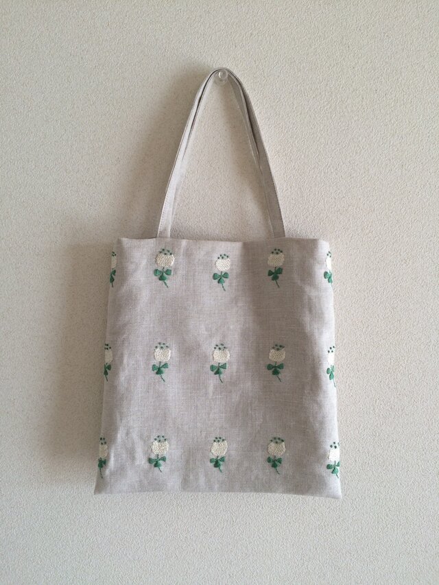 少し緑の つぼみが残っている シロツメグサをイメージして 刺繍しました。