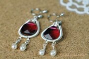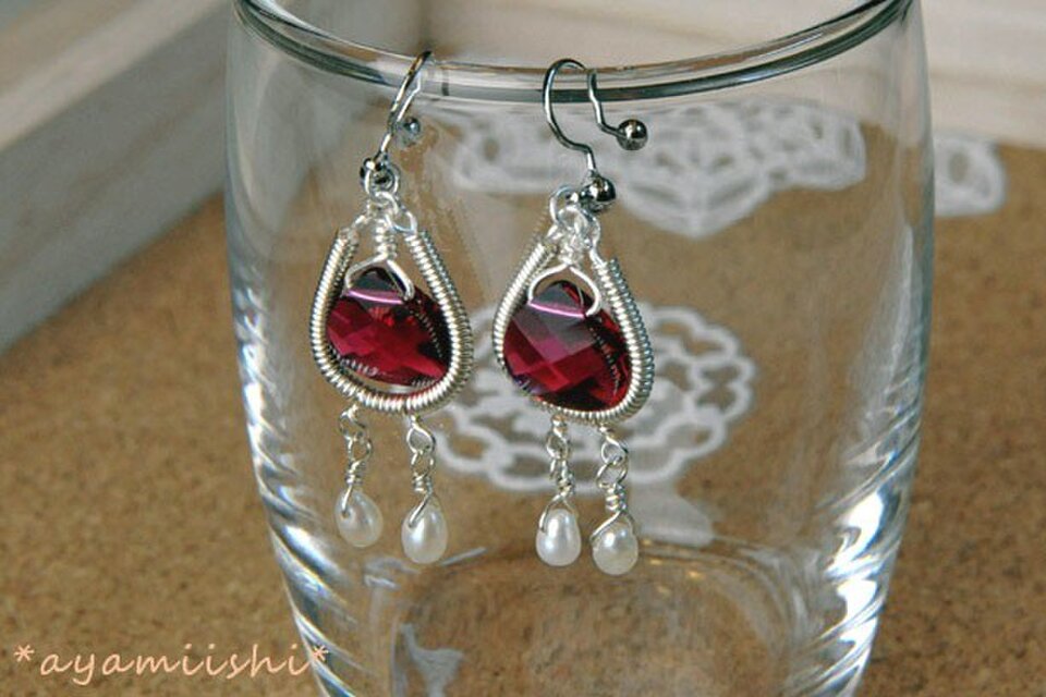 ルビーの色をしたしずく形のスワロフスキーをワイヤーで作ったコイルに下げて、小さな淡水パールをプラスしたピアスです。