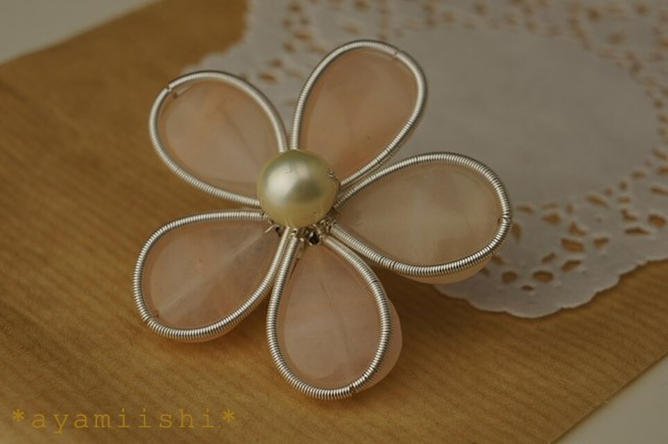 コイル状に巻いたワイヤーで縁取って、真ん中にはヴィンテージパールを使いました。
