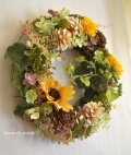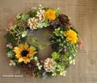 リース土台:ナチュラル素材 直径約20センチ リース素材:アーティフィシャルフラワ-(ひまわり・マリーゴールド・レディースマントル・グリーンネックレス・ビバーナムティナス・グリーンの実・グリーンとブラウンミックスの実・ユーカリ、など)、自然素材(松かさ・シダーローズ、など)