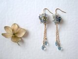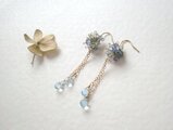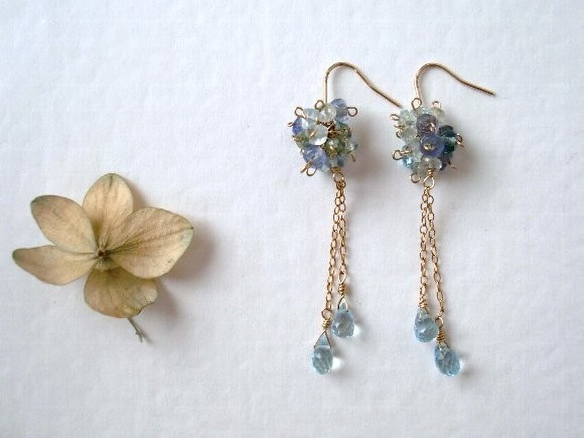 グラデーションのある青い紫陽花から滴る水の雫。そんなイメージで薄い水色やグラデーションのアクアマリンとタンザナイトで、ニュアンスのある青い紫陽花を表現しました。下には滴る水滴のイメージで小さなスイスブルートパーズのドロップを2本、長さ違いでぶら下げています。動く度にチェーンにぶら下げたトパーズのドロップ石がきらきらきらめく、透明感があるピアスです。細いフックを使っていますので、小さくて軽いです。