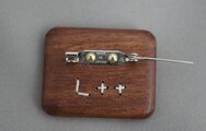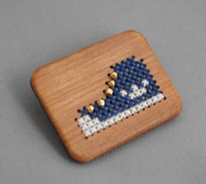 木に穴をあけ、クロススティッチでスニーカーをデザインしました。