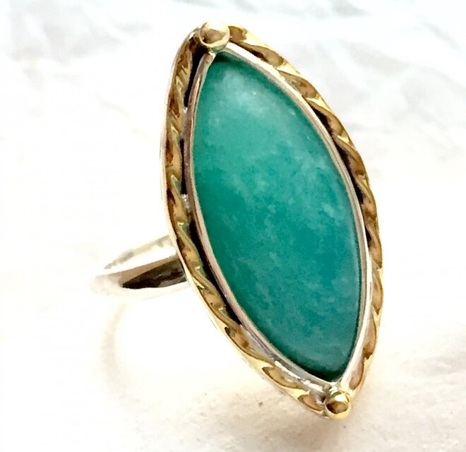 落ち着いた水色に白い柄の入った珍しいオパール、そのオパールの周りのおしゃれな飾り、とても素敵です。 すがすがしい印象のリングで、着け心地も良く、たいへん気に入りました。 速く対応して下さり、感謝しております。
