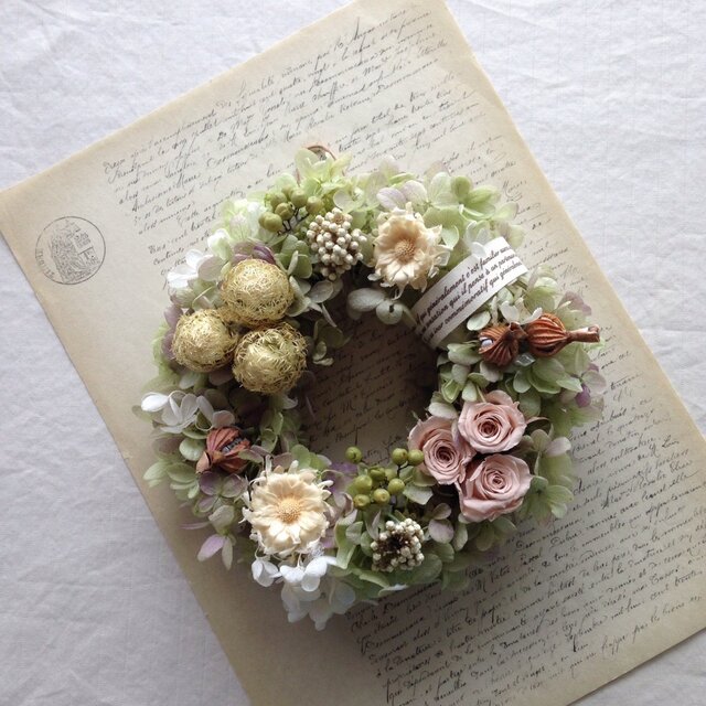 藁縄に柔らかな色合いのプリザーブドフラワーをリボンや飾りと組み合わせたハイセンスなしめ飾りが届きました。妻や娘もとても気に入ってくれました。 もういくつ寝ると・・・とお正月が待ち遠しくなります。 作品の他にThank youコメントのついた可愛らしいフラワーが添えられていたり、手書きのご挨拶が書かれていたりして、作品同様、作者様の温かい思いを感じる体験でした。ありがとうございました。