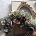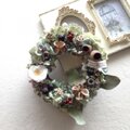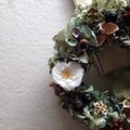 白いフレンチマリアンヌが映え、コロンとしたベルカムや赤い野ばらの実など色々な実物の表情が楽しめるリースです。