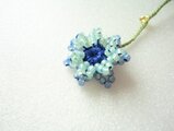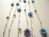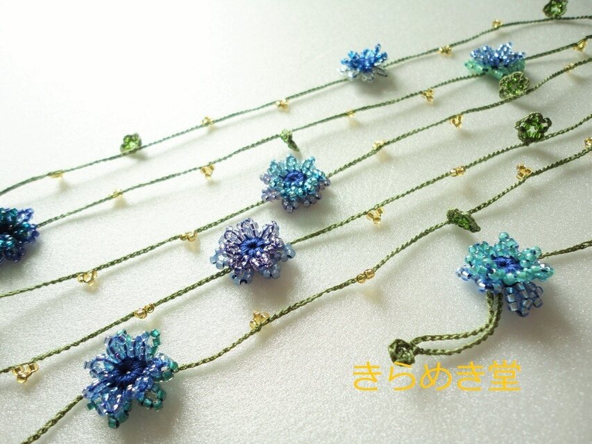 ビーズと綿100%の糸を使用している為、付心地も軽やかです。花のモチーフを10個編み込んでいますが、様々な青色のビーズを使用していますので、一つ一つモチーフの表情が違います。