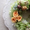 淡い3色のアジサイとオレンジのバラが可愛いプリザーブドフラワーのリースです。