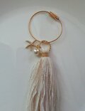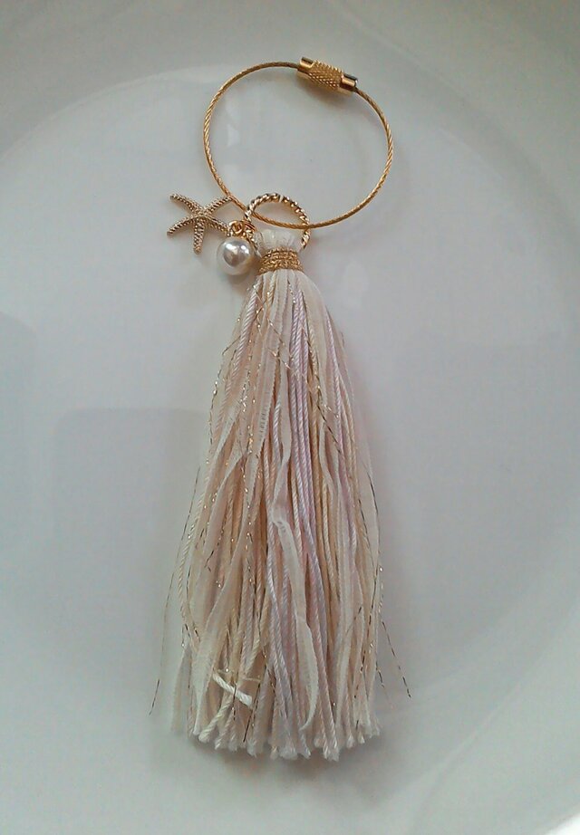 ラメ糸を混ぜ込んだチャーム付きタッセルキーリングです。