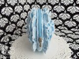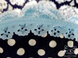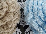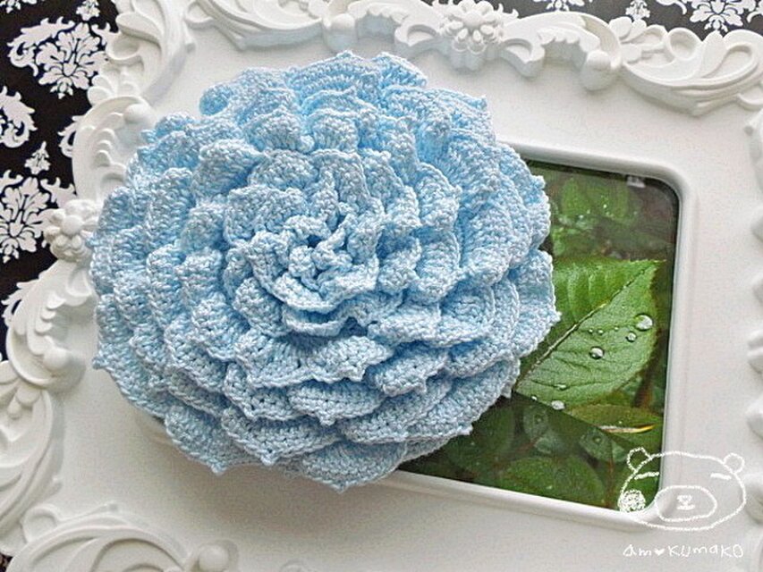 キラキラと光るラメがとても綺麗なレース糸です。赤やピンクがお好きな方ばかりではないと思いますので、ネイビーに加えて青系を増やしました。夏が似合う爽やかな水色の薔薇です。