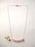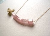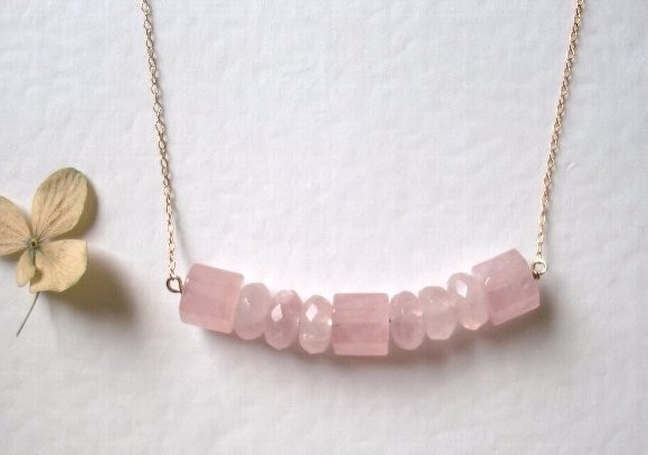 淡いピンクのローズクォーツの天然石らしいネックレスです。角柱型にカットされたチューブ型の間にオーバル型の石をつなげて一連にしました。天然石らしいしっかりした存在感とカットが華やかですが、半透明の淡い桃色が優しい印象です。