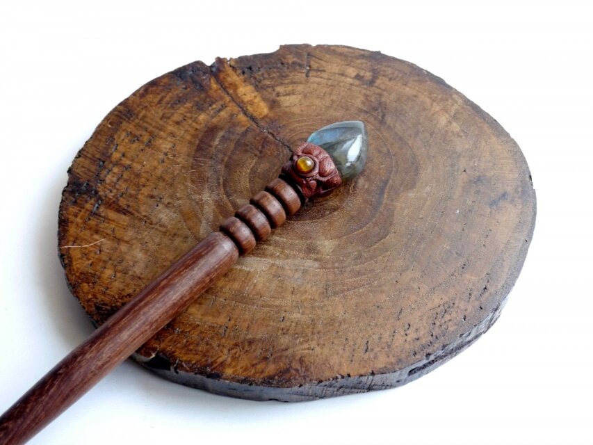柔らかな光を放つ天然石とウッドスティックを専用の樹脂で接着したオリエンタルなカンザシです。