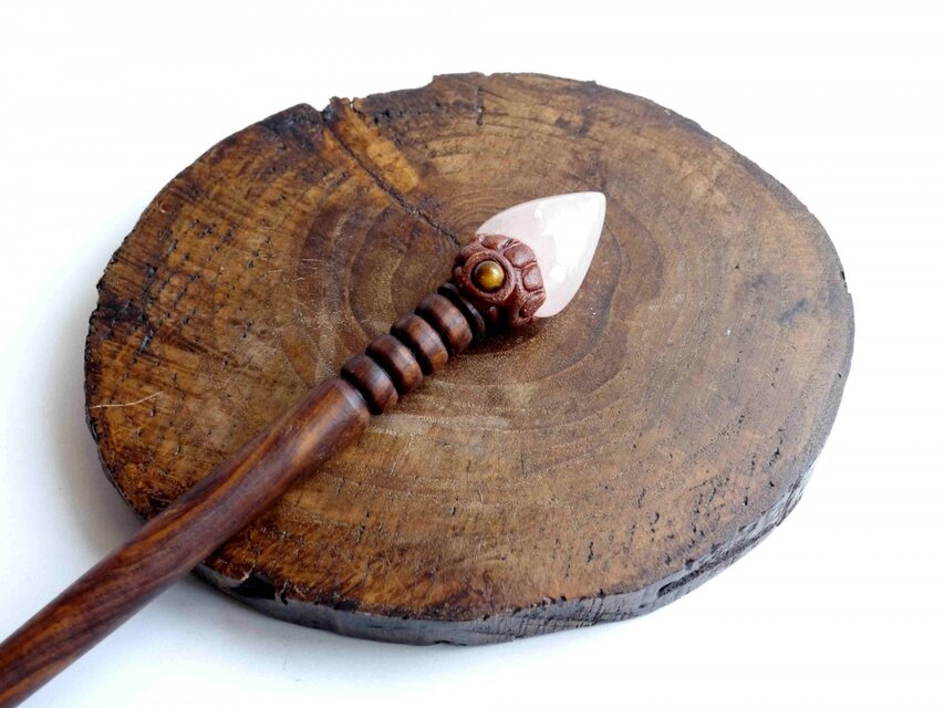 柔らかな光を放つ天然石とウッドスティックを専用の樹脂で接着したオリエンタルなカンザシです。