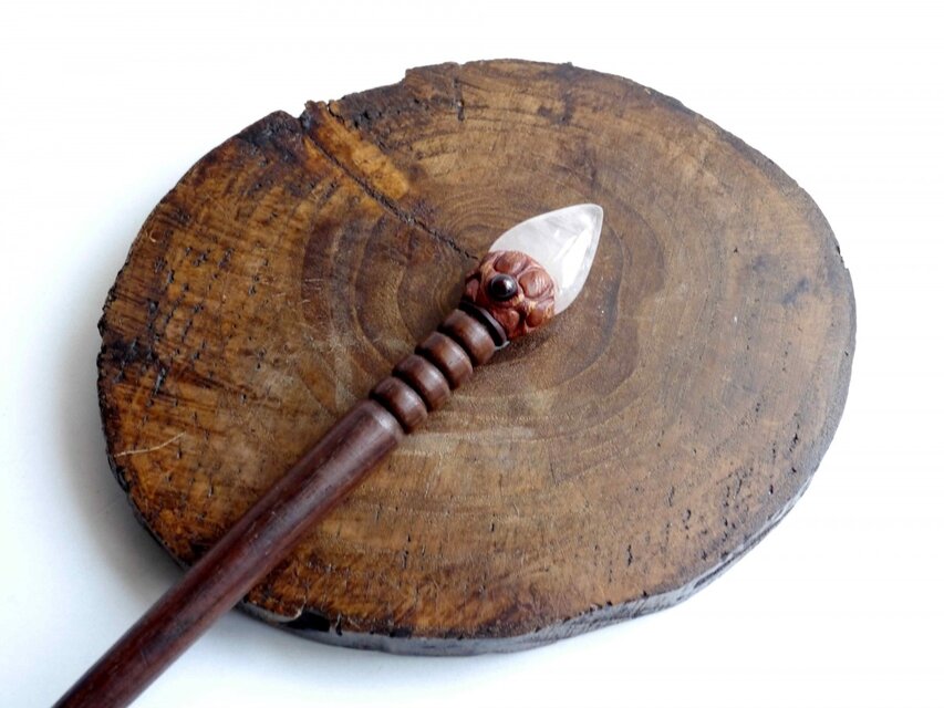 柔らかな光を放つ天然石とウッドスティックを専用の樹脂で接着したオリエンタルなカンザシです。