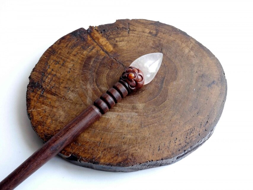 柔らかな光を放つ天然石とウッドスティックを専用の樹脂で接着したオリエンタルなカンザシです。