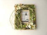 アンティーク加工されたウッドフレームにモスのグリーンと白の花々