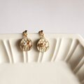 かわいらしい小さめなボタンに、落ち着いた色合いのスワロフスキーパール2色と、キラリと輝くスワロフスキービーズをアクセントに、シックで上品なピアスに仕上げました。