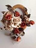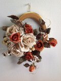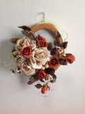 アンティークの色目の薔薇と渋いオレンジ色の薔薇を楕円形のフレームに入れて壁掛けにしました。薔薇の花弁に艶と毛足のある布を重ねて重厚な薔薇にしてあります。