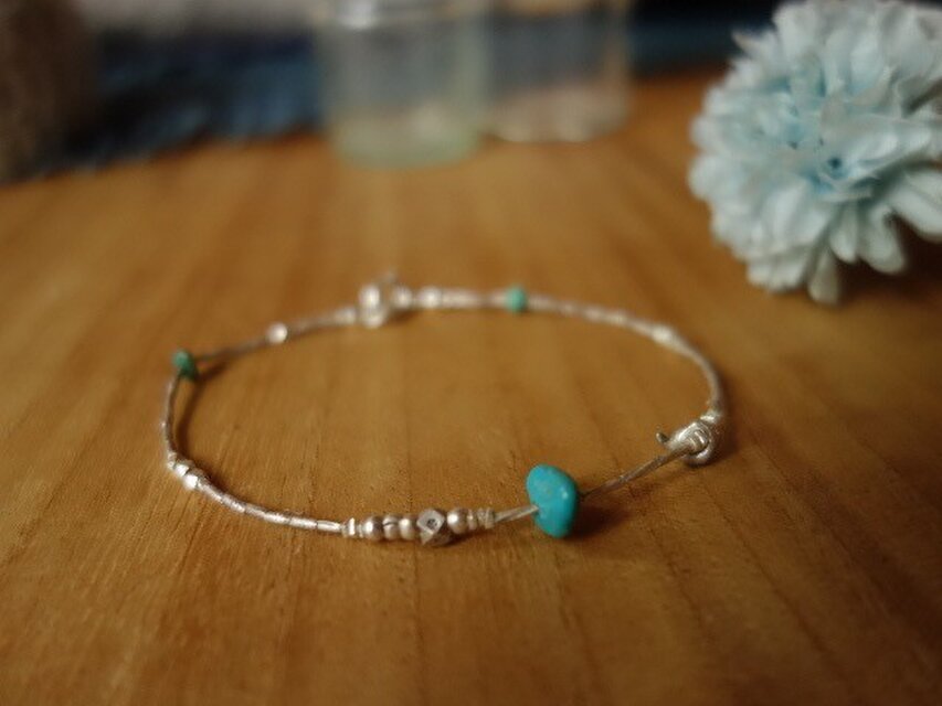 夏の陽射しがよく似合うカレンシルバーとターコイズのさざれで繊細なブレスレットができ上がりました。
