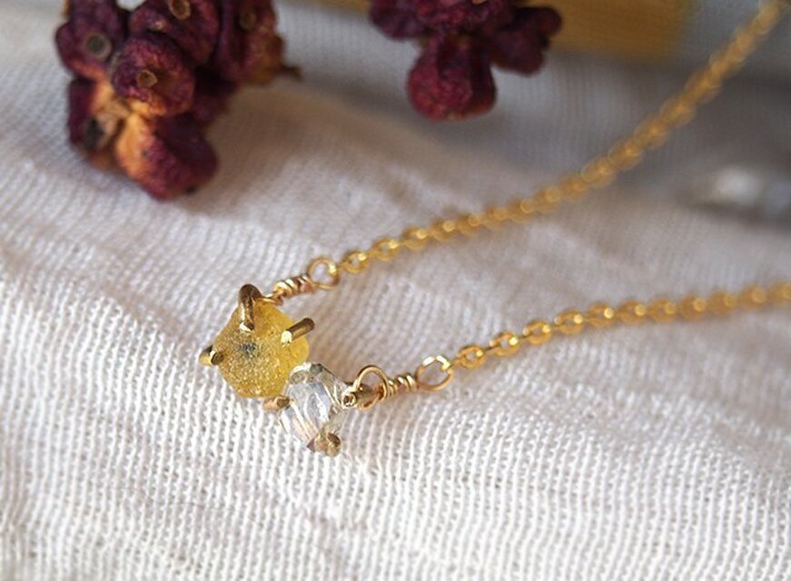 原石のイエローサファイアとダイヤモンドクォーツのネックレス w325