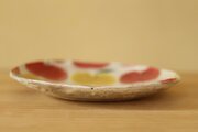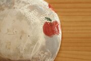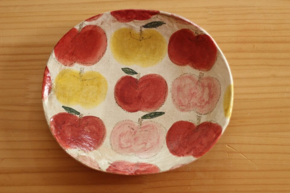 信楽の白土に白化粧を施し、赤いリンゴとピンクのリンゴと黄色いリンゴを絵付けしました。