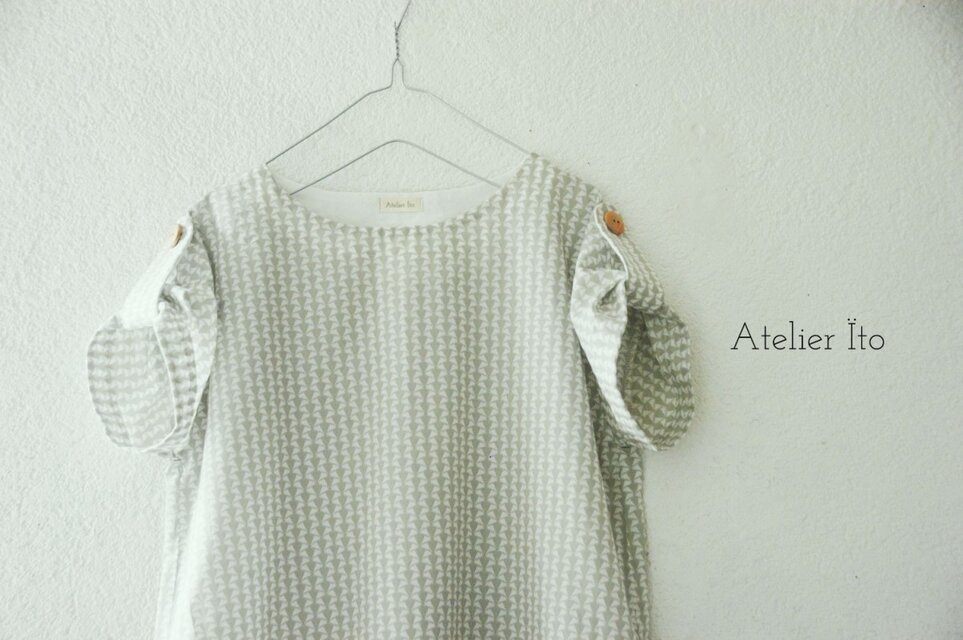 お袖は夏らしいロールアップ風で女性らしく....。(ボタンは固定されています。)